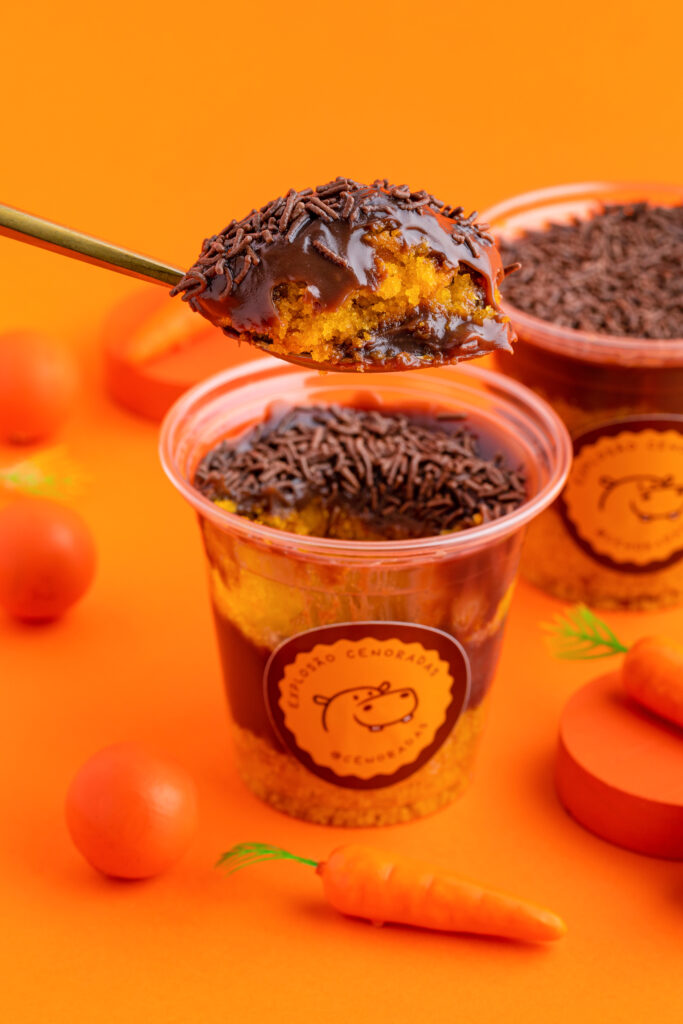 Explosão: Bolo de pote bem recheado: bolo de cenoura com diversas camadas, opções de dois amores, brigadeiro e doce de leite